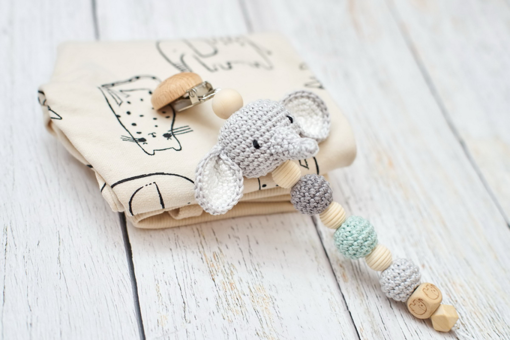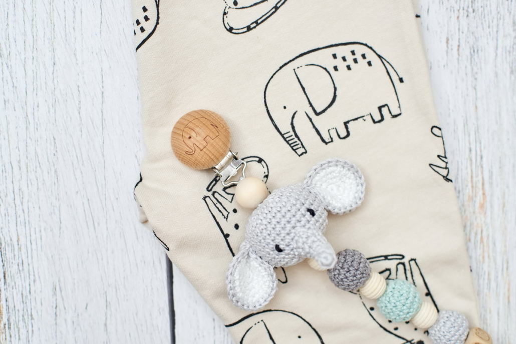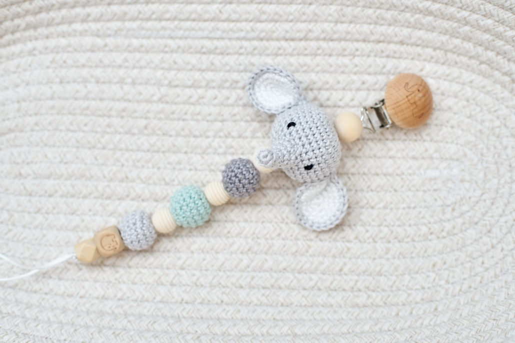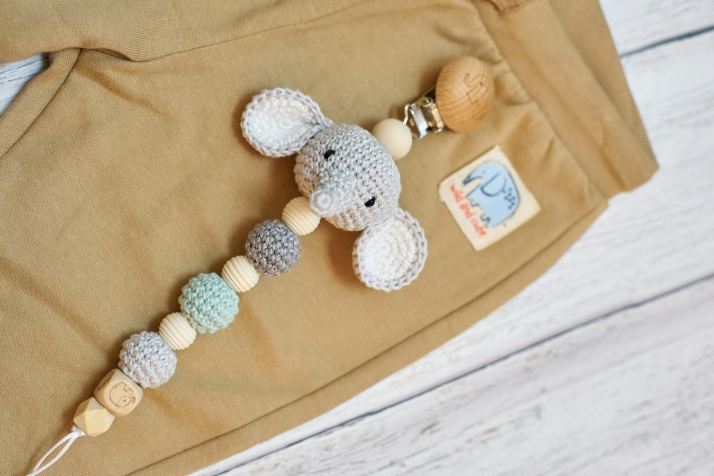 A cumilánc klipsz részénél egy kézzel horgolt, aranyos kis elefánt vonja magára a baba figyelmét, fa- és horgolt golyók kombinálásával készült, amiket kedvére bügyűrgethet, biztonságos csattal záródik és stabilan rögzíthető a ruhácskára, hogy az sose vesszen el.