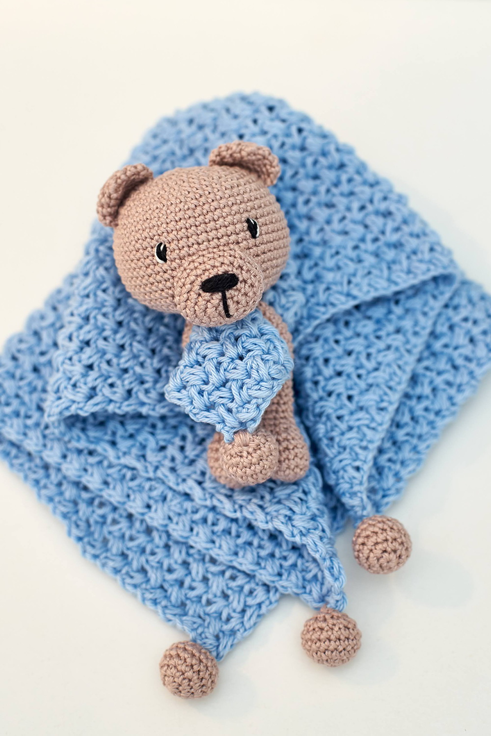 A puha, kellemes tapintású pamutfonalból készült takarórész ölelésre hív, a kedves kis mackó pedig hű társa lesz minden altatásnál, utazásnál vagy nyugodt pihenésnél.