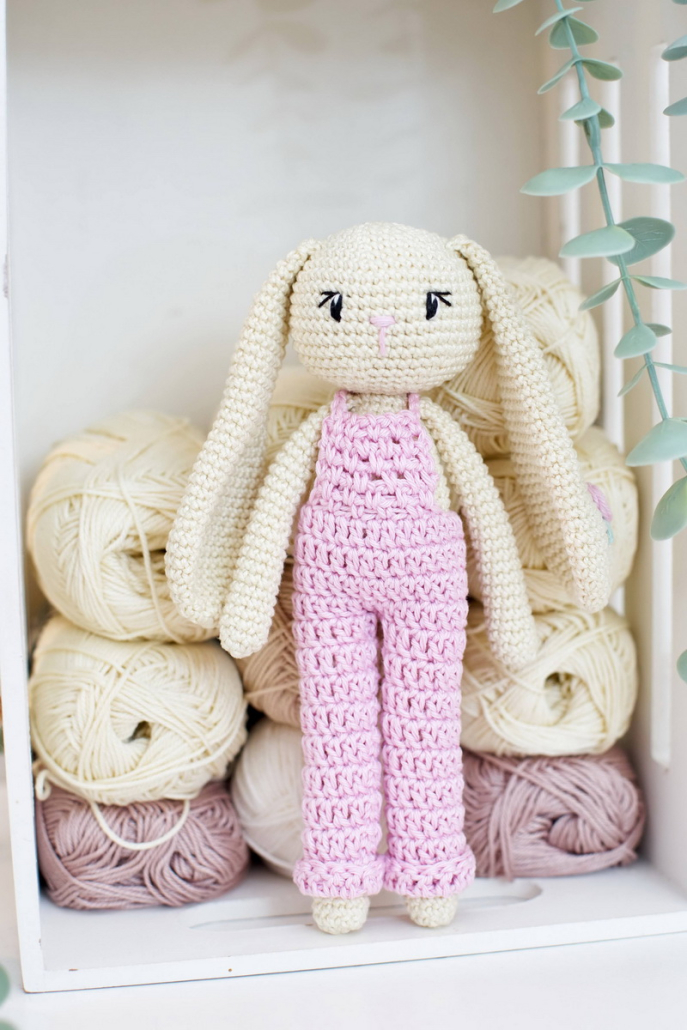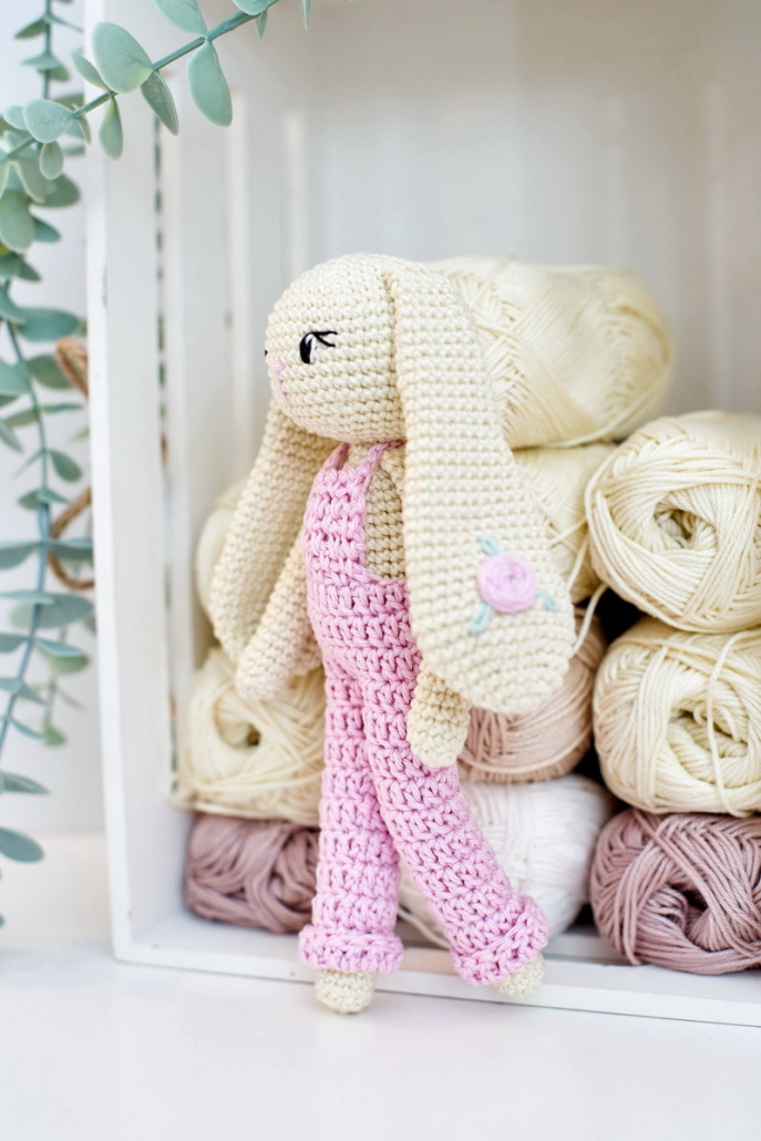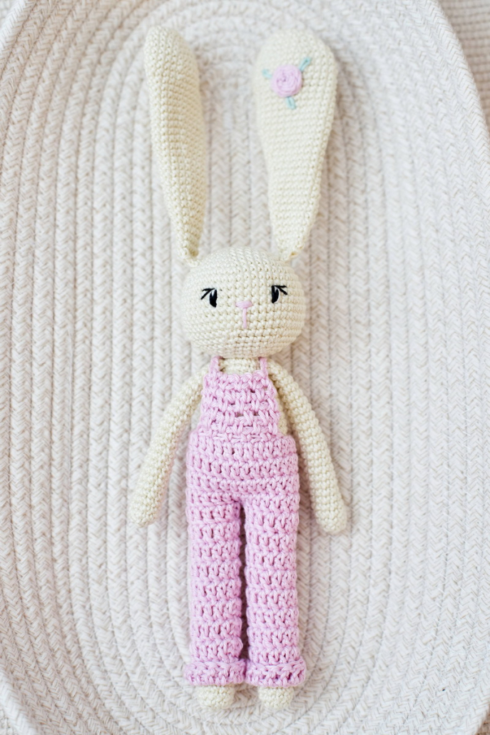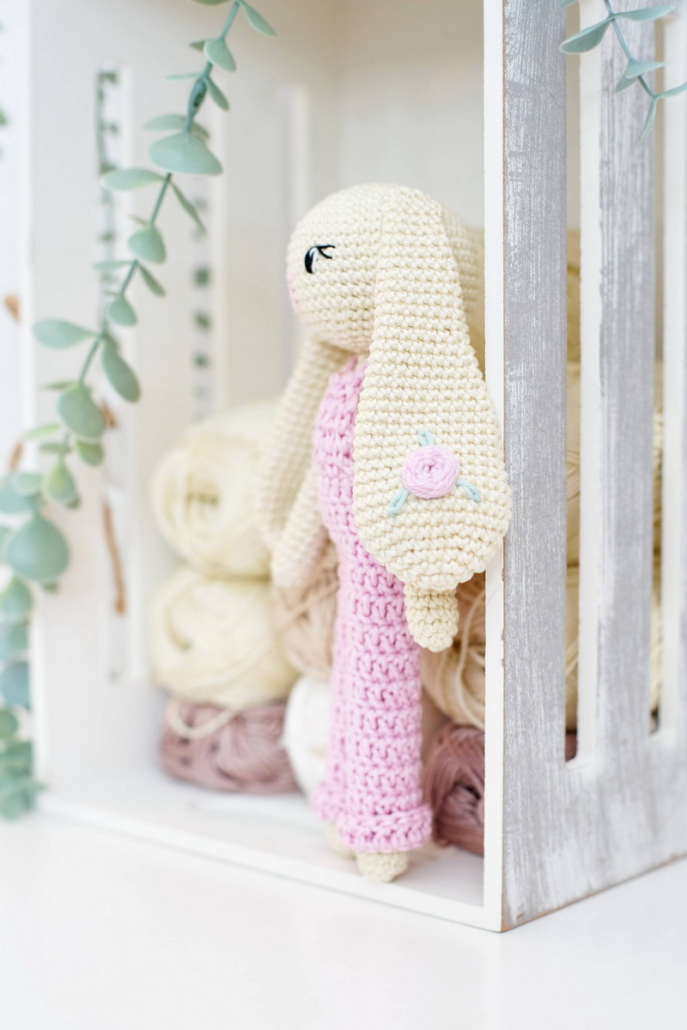 Horgolt nyuszi lógó fülekkel, virághímzéssel