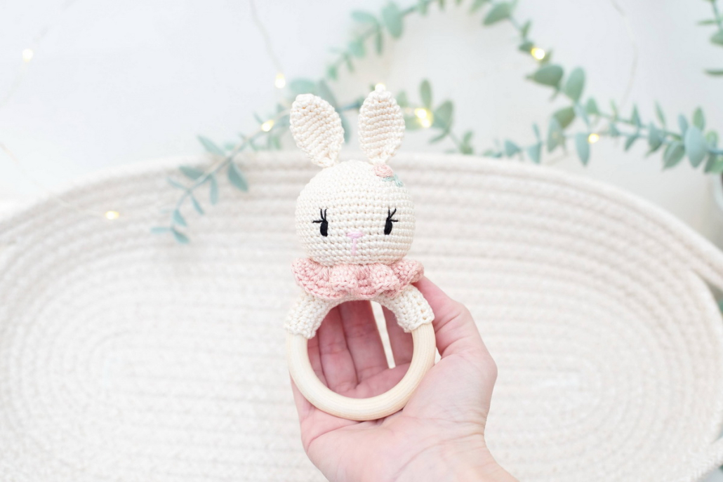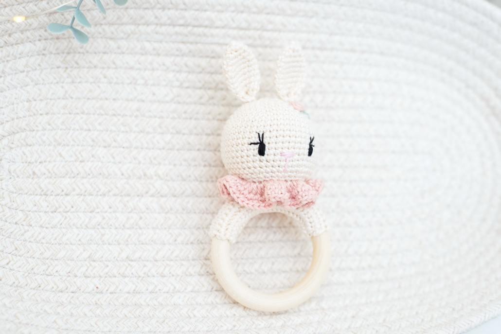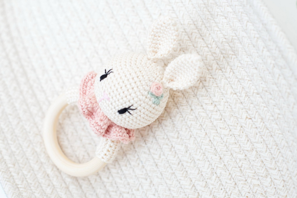 Horgolt nyuszi rágóka minimál virághímzéssel